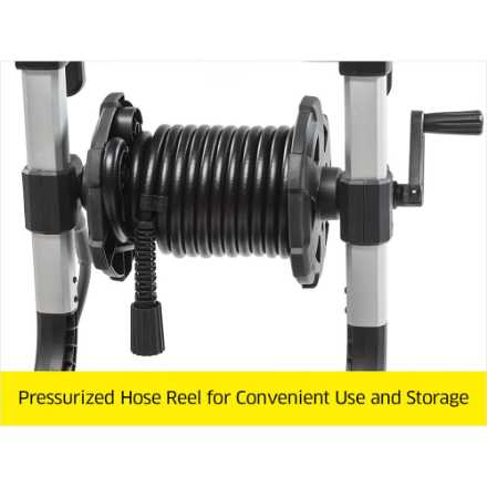 Pressurized hose reel for convenient use and storage of the high pressure hose