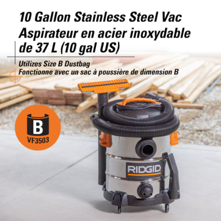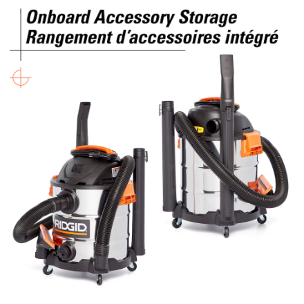 Take on projects confidently with the 37.5L (10 Gal.) 6.0 Peak HP Stainless Steel RIDGID Wet Dry Shop Vacuum that delivers powerful suction, mid-sized capacity, rugged construction, unique features and excellent mobility that pros demand for jobsite or the shop. This Vac comes with a 7 ft. hose, general debris filter, NXT Max floor tool with wet shoe, NXT Max car nozzle and two extension wands. The 37.5L (10 Gal.) vac includes 2-1/2 in. locking accessories for uninterrupted cleaning and the 2-1/2 in. diameter size resists clogs. Two locking extension wands extend reach while the bare floor tool cleans larger areas. Use the floor tool with wet shoe to clean liquid spills and the car nozzle for detailed cleaning. The blower port adds versatility and allows you to use the hose to blow leaves, grass clippings and more. Onboard caster feet storage for the attachments provides quick access. This vac features our Qwik Lock Filter that makes installing or removing your filter quick, and easy.