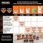 RIDGID offers a range of filtration options (VF4000 general debris filter, VF5000 fine dust filter, VF6000 HEPA material filter, VF7000 wet application filter, and VF8000 HEPA filter, sold separately)